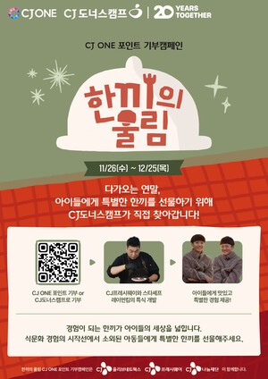 CJ도너스캠프가 겨울방학을 맞아 취약계층아동에게 즐거운 식문화 체험 기회를 제공하는 ‘한끼의 울림’ 기부 캠페인을 12월 25일까지 진행한다고 밝혔다.올해 출범 20주년을 맞이한 CJ도너스캠프는 “기업은 젊은이의 꿈지기가 되어야 한다”는 이재현 이사장의 사회공헌 철학을 바탕으로 2005년에 설립된 CJ나눔재단의 나눔 플랫폼이자 대표 브랜드다.‘한끼의 울림’ 기부 캠페인은 결식 우려 아동에게 특식을 제공해 즐거운 식문화 체험 기회를 선사하는 프로그램으로, 겨울방학 동안에 급식 및 돌봄 공백으로 인해 결식이 우려되는 아동을 비롯해 다양