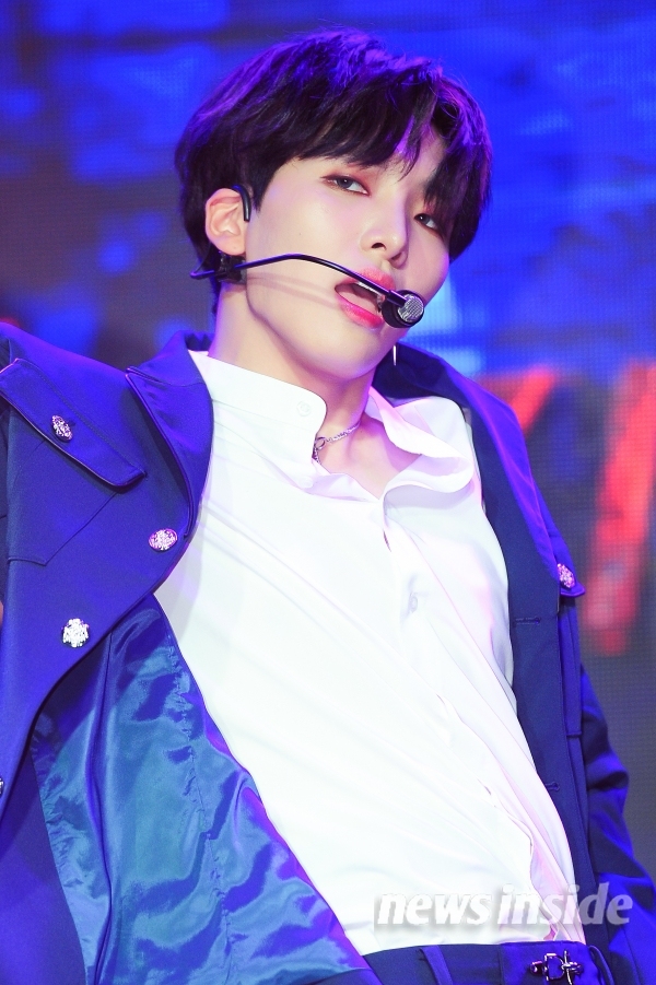 이날 원어스 서호가 신곡 무대를 선보이고 있다.